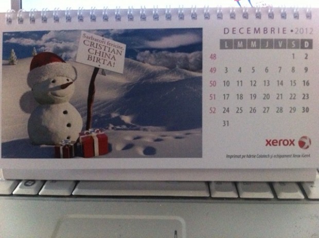 Dap, cam ce scrie și pe pancarta omului de zăpadă :)) Și toate lunile din calendarul de birou primit de la Xerox România sunt așa :))
