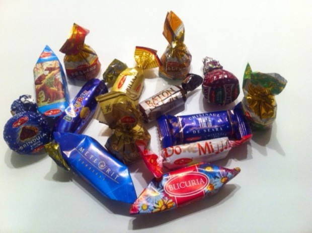 Bomboanele din imagine se numesc (aleatoriu): Inspirație, DoReMi, Bucurel, Meteorit, Bucuria, Favorit, Baton, Grilaj (preferatul meu, un caramel dur și teribil de gustos), Brândușa, Ursuleț, trei tipuri de bomboane Praline și, lăsat la urmă, Chișinăul de seară :)
