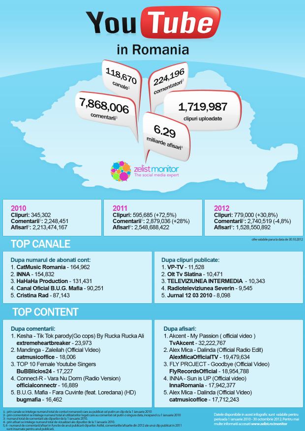 Ce vedeţi mai jos este un infografic al tovarăşilor de la Zelist Monitor, care tocmai ce s-au apucat să monitorizeze şi YouTube. Aşa l-am primit, aşa vi l-am dat, ca să nu ziceţi că le ţin pentru mine :D